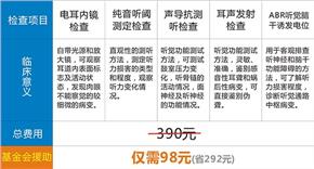 此次活动由中国五官科健康基金会对耳部疾病的人群进行基金援助,丹麦听力全套检查(电耳内镜检查、纯音听阀测定检查、声导抗测听检查、耳声发射检查、ABR听觉脑干诱发电位检查)一共390元,申请参与活动成功后,只需98元即可享受专业全面的耳鼻喉检查。
