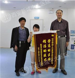 经张教授亲自主刀手术(“全安”疗法)后,马艳听力下降的症状也随之消失。手术后,马艳无右耳闷胀堵塞感,无听力下降、耳闷,无耳流脓,无耳痛,头晕、头痛等不适,家里人看到马艳痊愈特别感激。5月27日,为了感激张教授,马艳随同父亲不远千里,特意从榆林老家赶来西安中大耳鼻喉医院,与父亲一起亲自将锦旗送到张全安教授手中,称赞张教授“精湛的医术,崇高的医德”。了解更多中耳炎典型案例