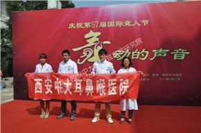 9月21日上午9时,由西安市残疾人联合会、高陵县残疾人联合会主办,西安中大耳鼻喉医院协办的第57届聋人节“舞动的声音”公益活动,在西安高陵县政府广场前上演了一场场无声的演出 ,150多聋人朋友通过书法、绘画、剪纸、刺绣、舞蹈等现场表演,充分向社会展示了他们独特的文化生活与积极进取、自强不息的精神风貌。活动期间西安中大耳鼻喉医院为聋人朋友、市民开展耳鼻喉健康筛查义诊,讲解听力保健,预防常识,深受社会各界的好评。